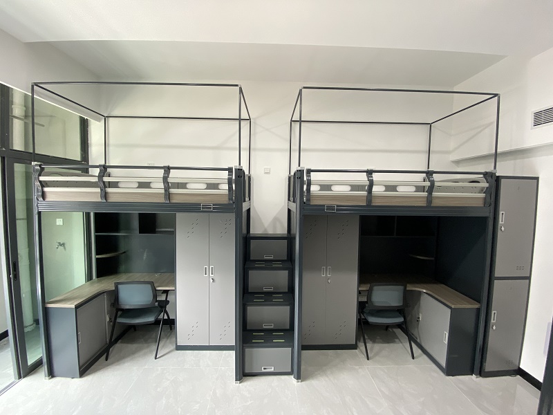 項目目前進展順利,一至三層樓正在進場安裝,宿舍房間明亮整潔,配置兩連體中梯公寓床,上有新款護欄加蚊帳桿,下有七字書桌配超大儲物柜,給員工創造獨立的私人空間。公寓床色調與宿舍裝修風格相協調,床體采用黑白灰設計,配色高雅,房間整體布局舒適溫馨。