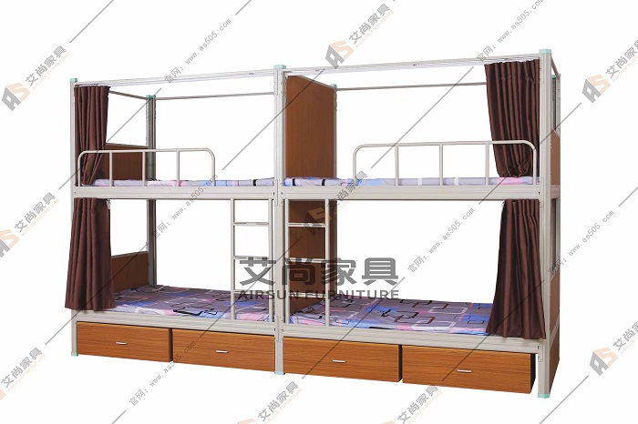 艾尚家具廠家制作的雙層上下鐵床立柱橫梁采用冷軋鋼板經特制成型線軋制而成,其立面為中空異形,立柱正面和側面有加強鋼筋,材料厚度為1.2mm。護欄高度達到235mm以上,更加強了措施。樓梯是另外的,支架采用方管焊接,腳踏板采用厚的冷軋鋼板沖壓而成。免攀爬,更方便上下床。整張床不用螺絲連接,倒掛卡扣,全程組裝。越睡越緊,根本不用擔心會斷!