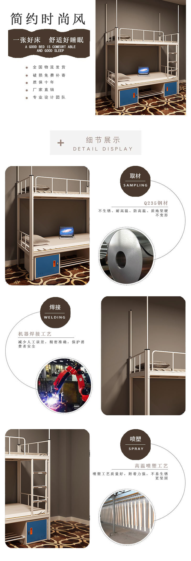 產品介紹: 單體中梯雙人位上下高低床,常規尺寸2530長*900寬*1800高mm(尺寸可根據客戶要求定制),本產品顏色使用白色、木紋色(顏色可按照客戶喜好定制),原材料使用1.2mm冷軋鋼板,床體承重500-1000kg,產品采用紙箱包裝防止運輸途中磨損,產品適用范圍企業、單位、工廠4人間宿舍均可適用。 本產品廠家質保十年!